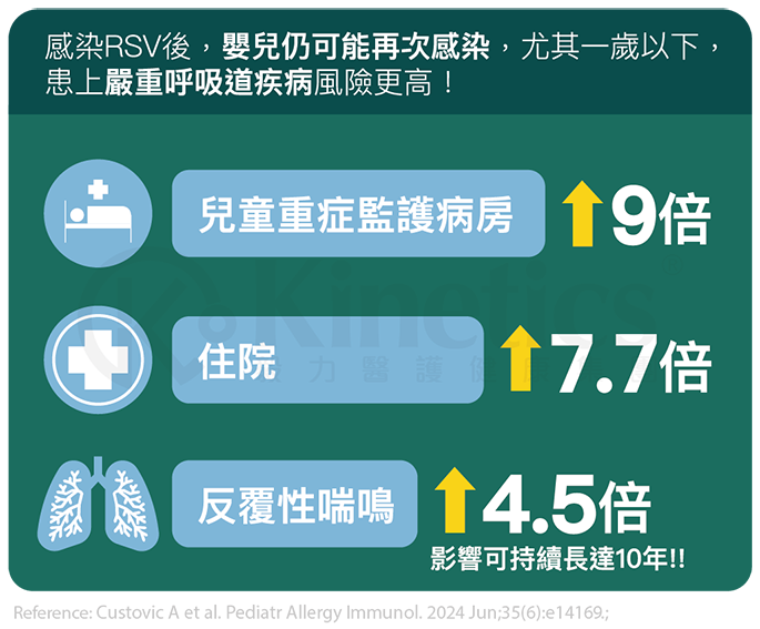 嬰幼兒感染RSV的風險極高,即使是足月且身體完全健康的嬰兒,也仍有感染機會,且與早產兒或患有長期疾病(如心肺病)的兒童嚴重後果相當,尤其是零至六個月這段高危期,因為此階段免疫系統尚未成熟,抗體水平較低,更易導致重症肺炎或支氣管炎需住院治療。與感染者密切接觸、處於人多擠逼環境,或家庭成員同時患病,均會大大提高傳染機會。因此,任何嬰兒都應採取預防措施,以減少感染風險並避免日後長期併發症,如哮喘。
